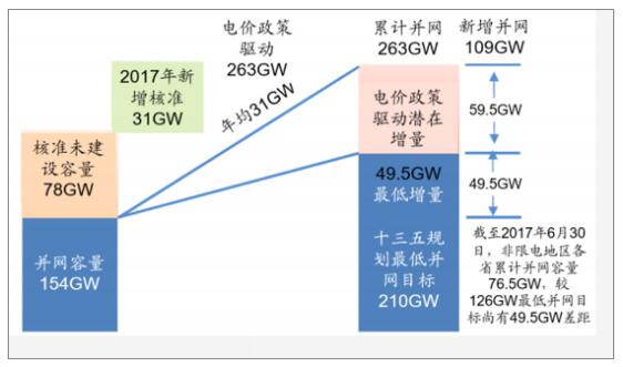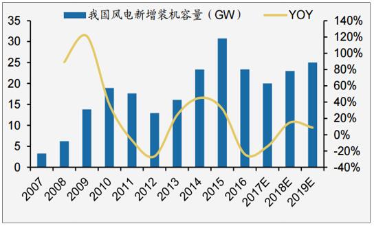 截至2016年底,我國已核準(zhǔn)未建設(shè)風(fēng)電項目容量合計78GW;2017年7 月國家能源局《2017-2020年風(fēng)電新增建設(shè)規(guī)模方案》提出2017年新增建設(shè)規(guī)模30.65GW; 2017年上半年,國內(nèi)風(fēng)電新增并網(wǎng)容量6.01MW,預(yù)計全年在17GW。