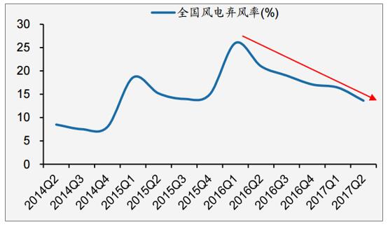 2015年的全國新增風(fēng)電裝機32GW,使得2016年1季度全國棄風(fēng) 率的平均水平到達26%,裝機量和棄風(fēng)率都創(chuàng)歷史新高,而后企業(yè)新增裝機的動力降低。隨著限電的改善和運營商盈利的好轉(zhuǎn),再加上降電價等多種因素的刺激,新增裝機有望提升。2017年上半年全國限電率為14%,持續(xù)獲得改善。限電的持續(xù)下降有望推動裝機的提升