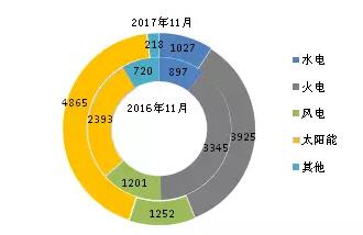 1-11月,全國電源新增生產能力(正式投產)11286萬千瓦,較上年同期多投產2729萬千瓦,同比增長31.9%。其中水電1027萬千瓦,較上年同期多投產130萬千瓦,同比增長14.5%;火電3925萬千瓦,較上年同期多投產580萬千瓦,同比增長17.3%;核電新增218萬千瓦,較上年同期少投產503萬千瓦;風電1252萬千瓦,較上年同期多投產50萬千瓦,同比增長4.2%;太陽能發電4865萬千瓦,較上年同期多投產2393萬千瓦,同比增長103.3%。