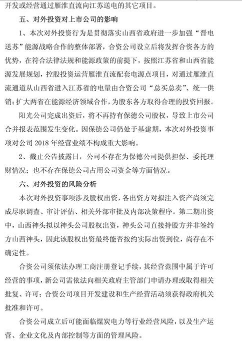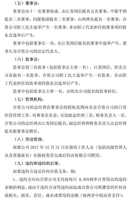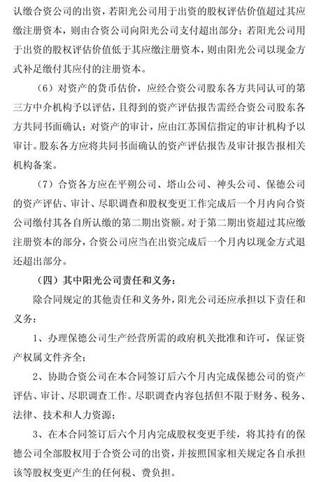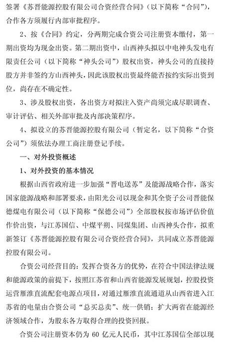 由陽光公司以現(xiàn)金和其全資子公司晉能保德煤電有限公司(以下簡稱“保德公司”)全部股權(quán)按市場評估價值作價出資,與江蘇國信、中煤平朔、同煤集團、山西神頭合作,擬重新簽訂《蘇晉能源控股有限公司合資經(jīng)營合同》,共同成立蘇晉能源控股有限公司。