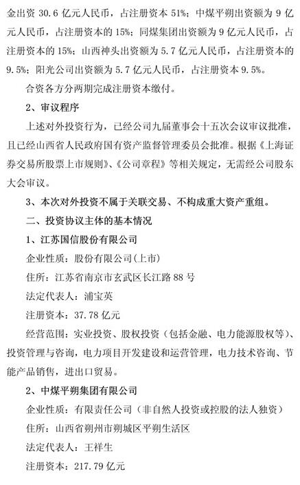 合資公司注冊資本仍為60億元人民幣,其中江蘇國信全部以現(xiàn)3金出資30.6億元人民幣,占注冊資本51%;中煤平朔出資額為9億元人民幣,占注冊資本的15%;同煤集團出資額為9億元人民幣,占注冊資本的15%;山西神頭出資額為5.7億元人民幣,占注冊資本的9.5%;陽光公司出資額為5.7億元人民幣,占注冊資本9.5%。