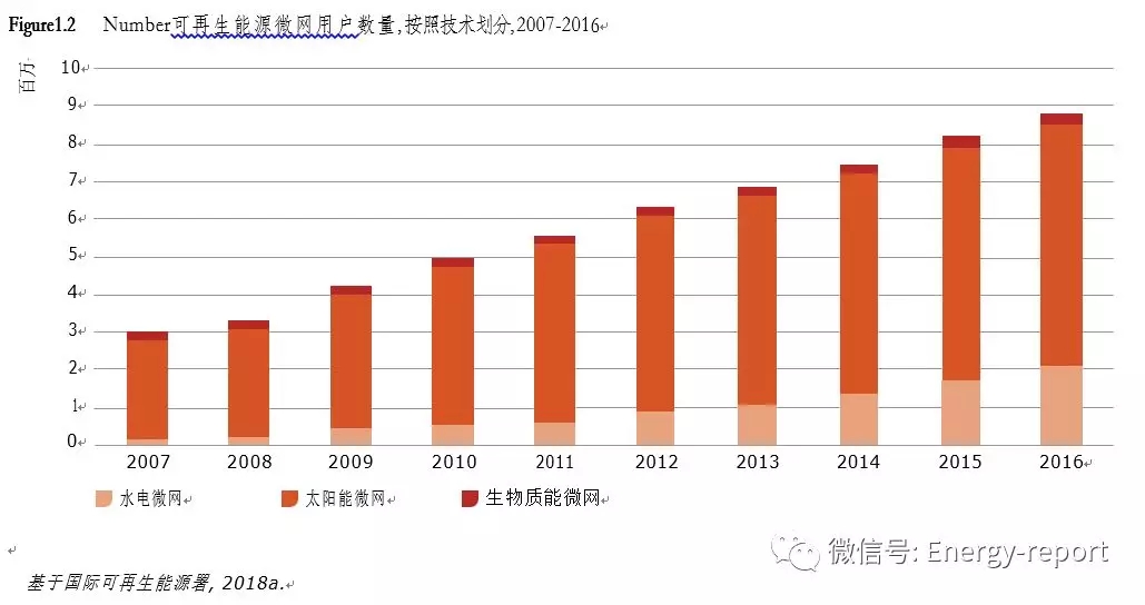 在過去十年中,可再生能源微電網的數量穩步增長? 小型水電微電網是最廣泛應用的,將大多數終端用戶連接到微電網中(圖1.2)?由于成本的快速降低和技術的大幅改進,太陽能光伏(PV)最近得到了迅猛增長,從2008年的11兆瓦容量增加到2017年的308兆瓦?