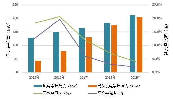 圖1 2015-2019年風(fēng)、光累計(jì)裝機(jī)量及棄風(fēng)、棄光率