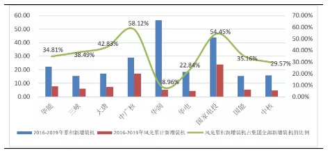 九大電力央企集團2016-2019風電和光伏新增裝機情況(GW,%)