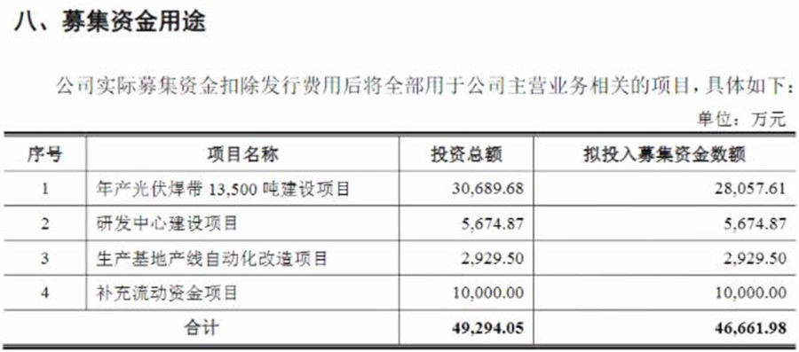 據招股說明書顯示,宇邦新材擬募資4.67億元,將用于年產光伏焊帶13500噸建設項目,擬投入募資金額約2.8億元,占比約60%;研發中心建設項目,擬投入募資金額約5674.87萬元,占比約12%;生產基地產線自動化改造項目,擬投入募資金額2929.5萬元,占比約6.2%;補充流動資金項目,擬投入募資金額1億元,占比約21.4%。