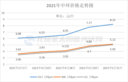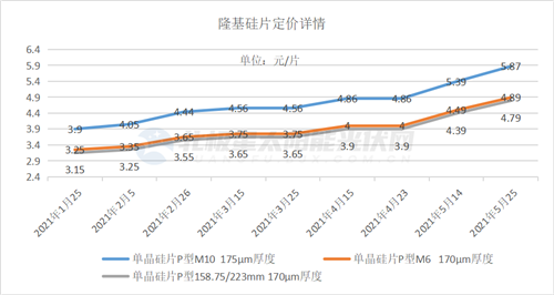 值得關注的是,硅料價格上漲壓力正在不斷向下傳導。5月,兩家硅片龍頭企業一個月內相繼2次宣布上調了硅片價格。截止至5月末,隆基M10硅片最新報價達5.87元,M6硅片價為4.89元,G1硅片價為4.39元,較4月23日的報價漲幅分別為20.78%、22.25%、22.82%。中環G12( 170μm)硅片最新價格為8.22元、M6( 170μm)硅片價為5.13元,G1( 170μm)硅片價為5.03元,分別較4月28日報價上漲25.5%、24.6%、27.99%。