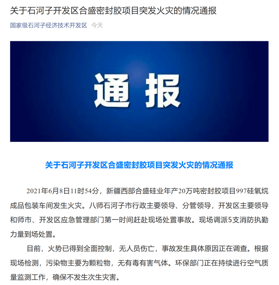 6月8日,據相關消息,新疆石河子合盛硅業20萬噸有機硅廠硅石反應爐爆炸。12點25分左右,合盛周邊企業天鋁、天富北電及大全硅廠辦公室行政人員開始撤離,生產人員部分留守;石河子北十五路封閉進行交通管制,石河子11道、12道場站向天鋁,天富集裝箱倒短車輛全部停止作業。