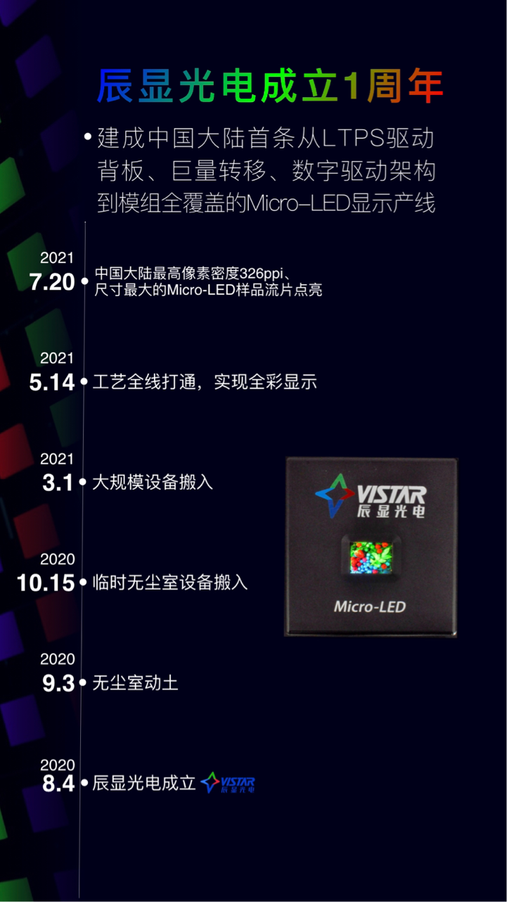 據(jù)悉,成都辰顯光電有限公司成立于2020年8月4日,投建的Micro-LED顯示產(chǎn)線于2021年3月1日開始設(shè)備搬入,5月14日完成工藝全線打通并實(shí)現(xiàn)全彩顯示,7月20日成功點(diǎn)亮326 ppi的1.84英寸Micro-LED可穿戴產(chǎn)品。僅用不到1年時(shí)間,辰顯光電率先建成中國大陸首條從LTPS驅(qū)動(dòng)背板、巨量轉(zhuǎn)移、修復(fù)到模組全覆蓋的Micro-LED顯示產(chǎn)線,創(chuàng)造了全球業(yè)界產(chǎn)線建設(shè)的最快速度。