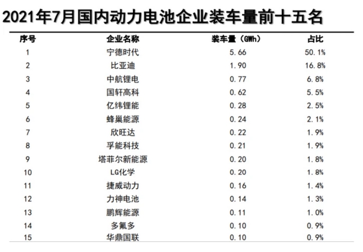 根據(jù)8月11日中國汽車動(dòng)力電池產(chǎn)業(yè)創(chuàng)新聯(lián)盟的數(shù)據(jù)顯示,7月份國內(nèi)動(dòng)力電池企業(yè)裝車量前五名分別為:寧德時(shí)代(50.1%)、比亞迪(16.8%)、中航鋰電(6.8%)、國軒高科(5.5%)、億緯鋰能(2.5%)。