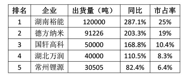 2021年中國市場磷酸鐵鋰材料出貨量TOP5