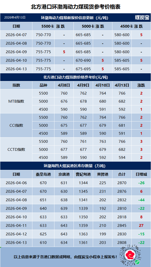 但在動力煤方面,最近這幾天,不少老煤炭人都看懵了。按理說,淡季之下需求疲軟,煤價應該大面積跳水。但現實卻是:港口煤價小幅回漲,4月13日MTB環渤海動力煤指數再次上調1-2元/噸,5500卡動力煤已報766元。當前市場交投活躍度顯著提升,就連前期略有降溫的無煙煤價格也開始偏穩運行!