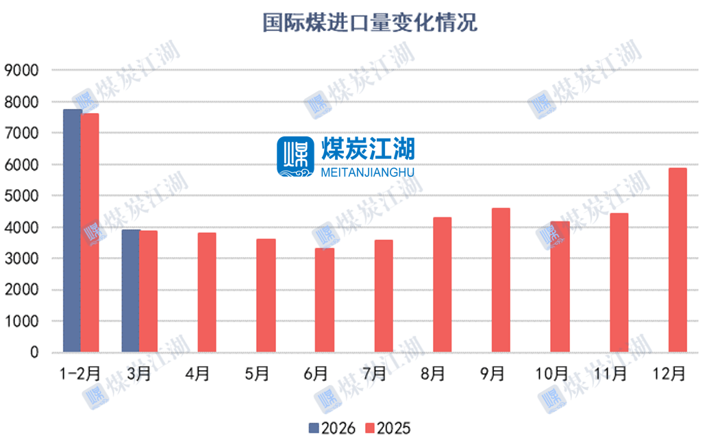 3月份煤炭進口量同環(huán)比均增:據(jù)海關公布的數(shù)據(jù)顯示,2026年3月份,我國進口煤炭3905.9萬噸,較去年同期增加32.7萬噸,同比增長0.8%;較2月份增加了811.6萬噸,環(huán)比增長26.2%。2 月份受春節(jié)假期等因素影響,煤炭進口量相對較低。3 月份企業(yè)復工復產全面推進,工業(yè)生產對煤炭需求顯著回升,電廠、化工等企業(yè)積極補庫,帶動煤炭進口量增加。