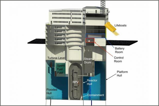 這一構(gòu)想的平臺(tái)可以在船塢中建造,然后拖曳到距離海岸幾海里的較深海區(qū)。它可以通過(guò)海底電纜與電網(wǎng)相接。這種平臺(tái)可以避開(kāi)地震,還能承受海嘯打擊。其設(shè)計(jì)結(jié)構(gòu)能帶來(lái)足夠的安全性。特別是散熱器浸入海洋可以保證反應(yīng)堆制冷的穩(wěn)定可靠,并能避免外部干擾。