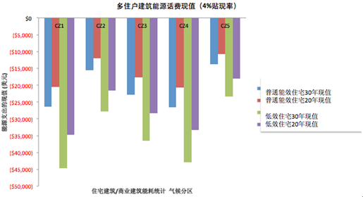 通過計(jì)算多住戶建筑平均用能支出和低效住宅建筑用能支出,落基山研究所以4%貼現(xiàn)率對(duì)比了多住戶建筑用能支出的現(xiàn)值。我們發(fā)現(xiàn),凈零排放改造最具經(jīng)濟(jì)吸引力的區(qū)域是第1氣候區(qū)域,第4區(qū)緊隨其后。